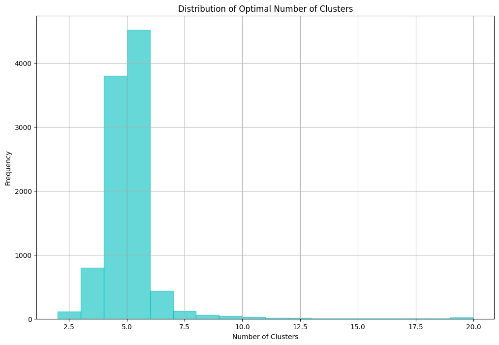 My replication showing the distribution of optimal number of clusters. Note that the majority of networks have 4-5 clusters, just as in the original paper's Figure 3.