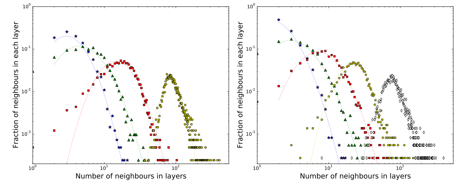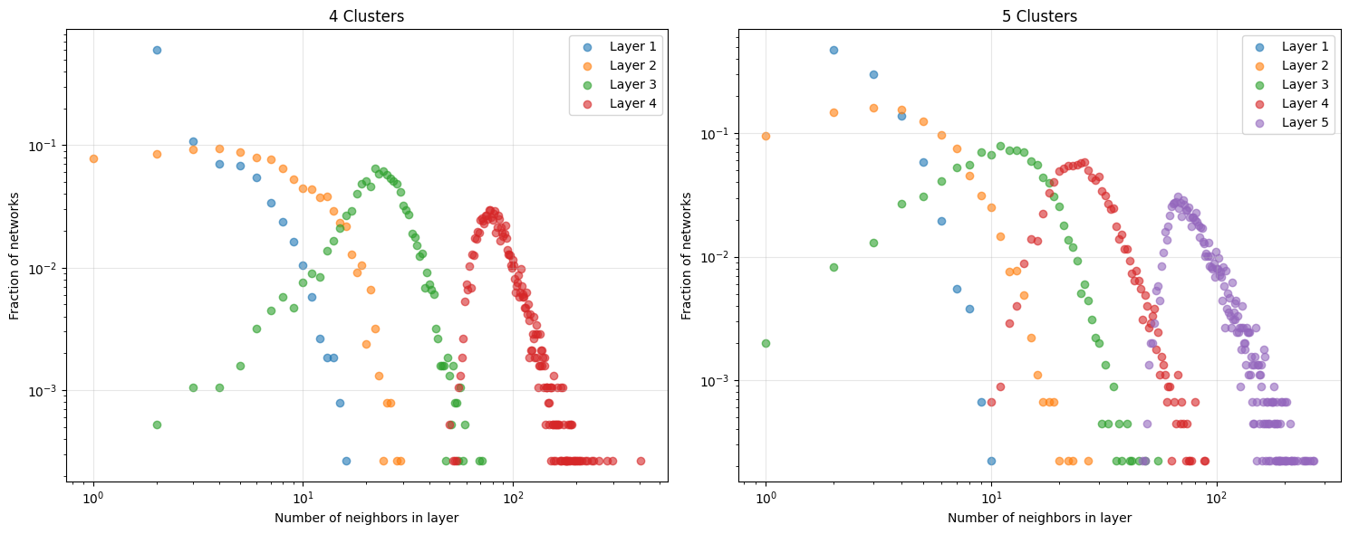 My replication of the paper's Figure 4, showing the distribution of the number of contacts in each layer for networks with 4 clusters (left) and 5 clusters (right). Note the log-normal distribution of each layer, closely matching the original paper's findings.