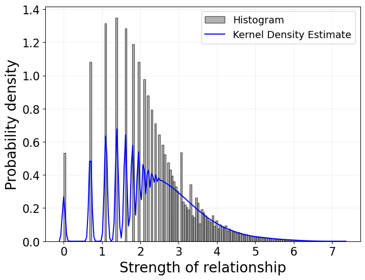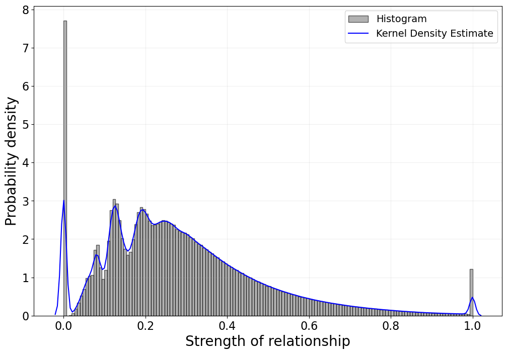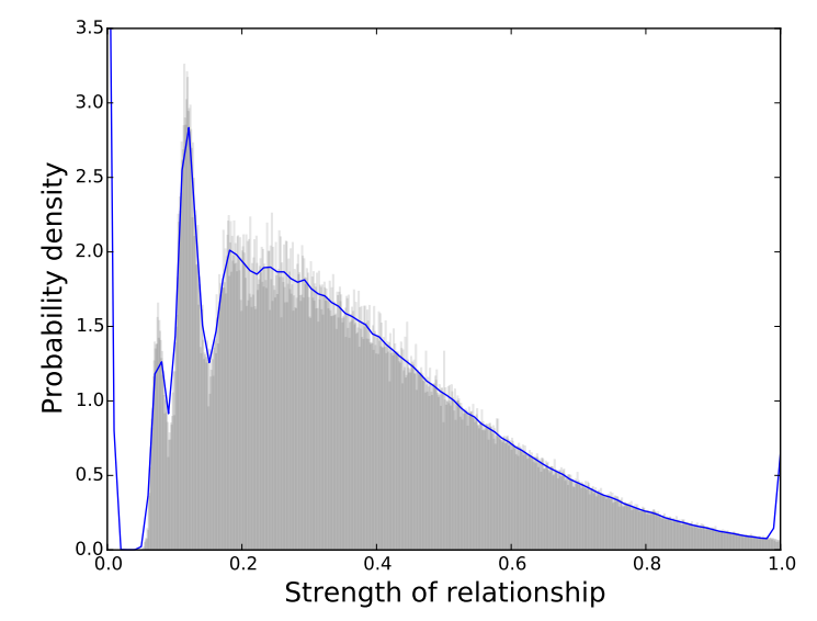 My replication of the paper's Figure 2, showing the histogram and kernel density estimate of normalized relationship strengths.